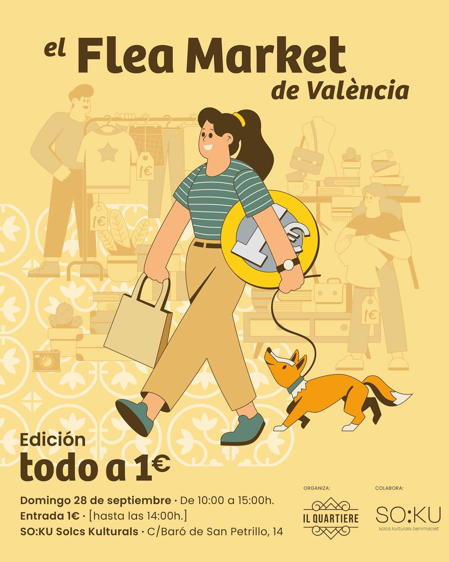 El domingo 28 de septiembre de 2025 vuelve el Flea Market Valencia con una edición especial “Todo a 1 Euro”. Se celebrará en Solcs Kulturals – CIM Benimaclet (c/ Barón de San Petrillo, 14), un espacio cultural con barra y cocina, muy próximo (menos de 300 m) de la estación de metro/tranvía de Benimaclet.