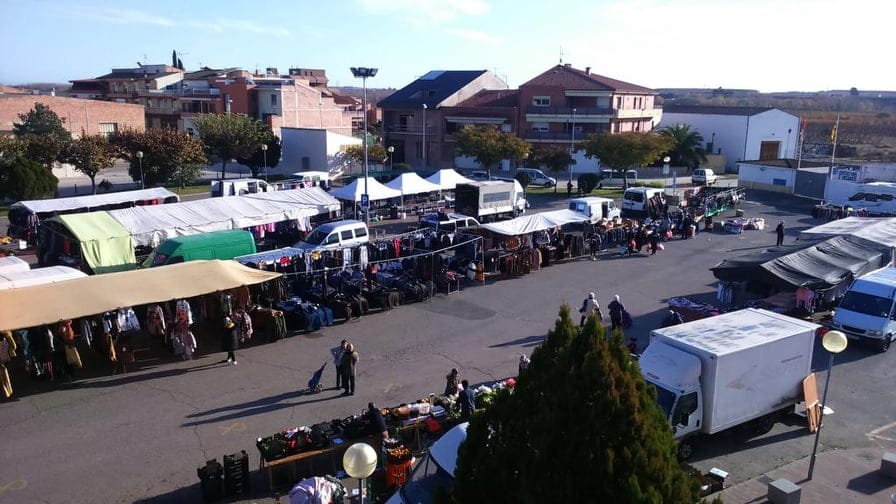 Mercadillo de Torrefarrera: domingos de 9:00 a 14:00 con más de 200 puestos. Fruta, ropa, pollos asados y ambiente popular junto a la A-2.