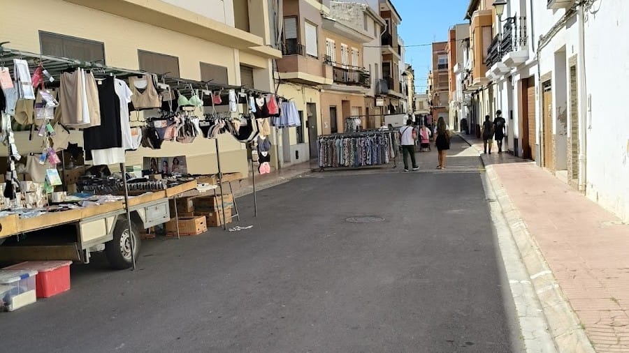 El mercado semanal en Museros se celebra los viernes de 9:00 a 14:00 en la Avenida de la Estación con 20 puestos de frutas, ropa, hogar, etc.