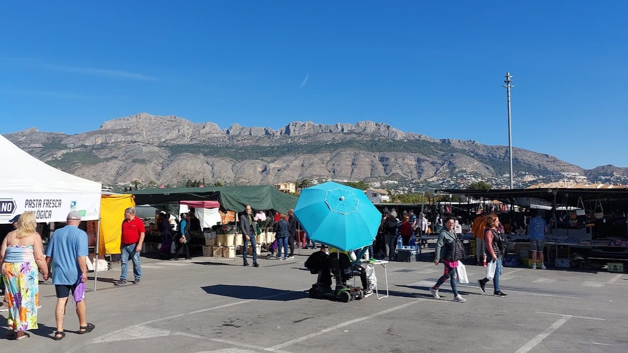 Mercadillo de alimentación de Altea: todos los martes de 9:00 a 14:00 en la Avenida de La Nucía. Fruta, quesos, pan y productos frescos a buen precio.