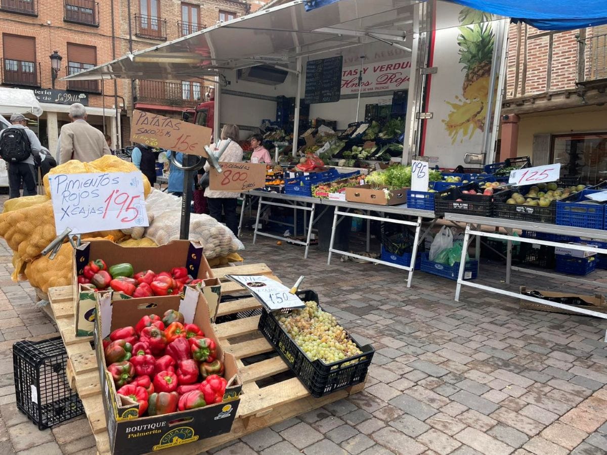 El mercadillo en Villada se celebra los miércoles de 9:00 a 14:00 en la Plaza Mayor con puestos de alimentación, textil, hogar, pollos asados, etc.