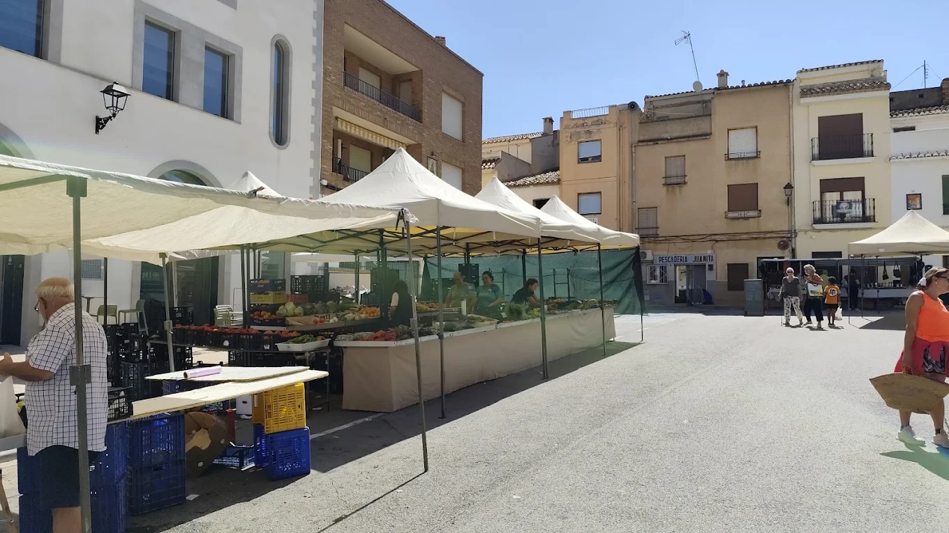 El mercadillo de Chelva se celebra los sábados de 9:00 a 14:00 en la Plaza Mayor con unos 40 puestos de alimentación, ropa, hogar, etc.